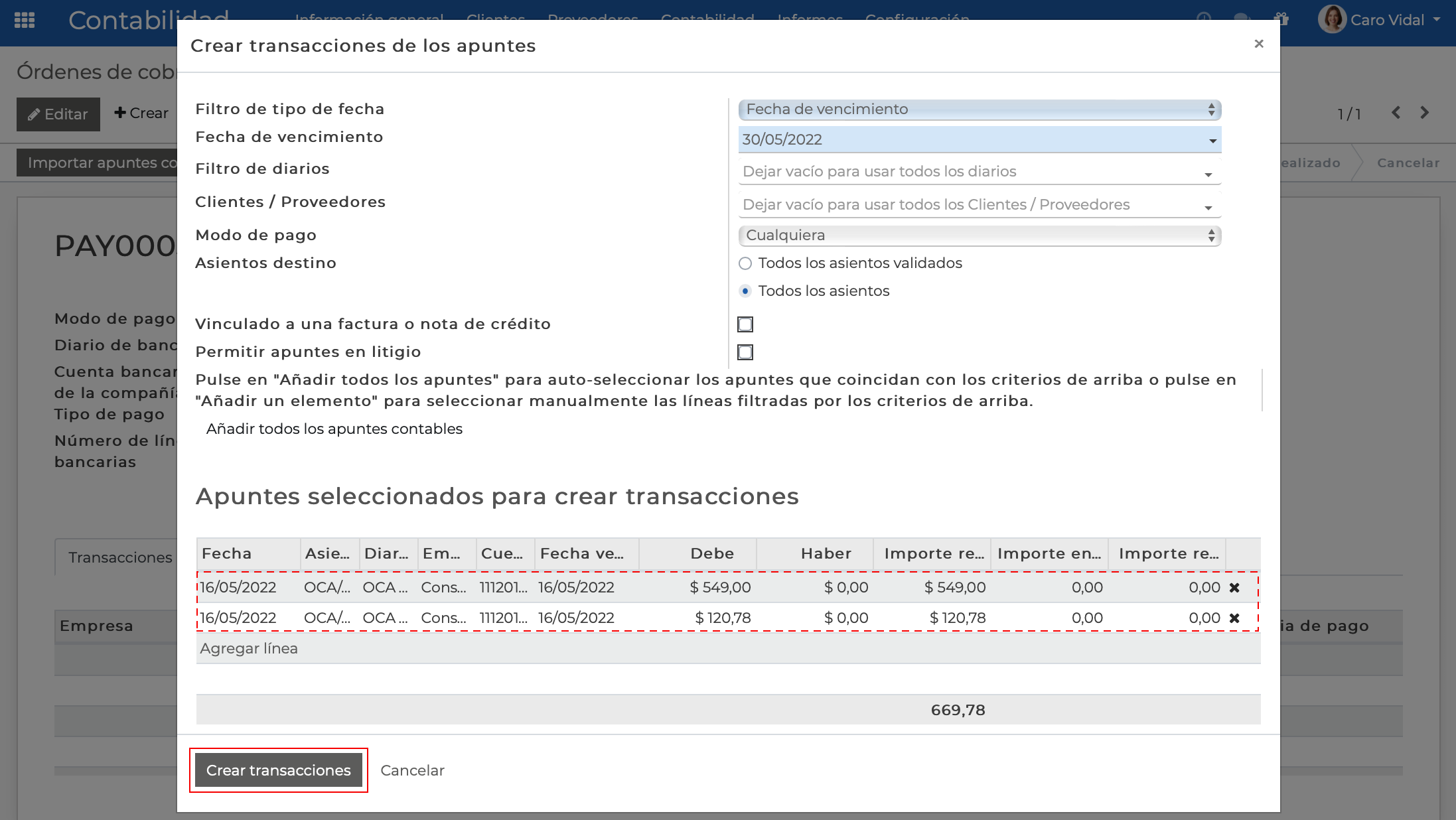 Luego de haber seleccionado las líneas de apuntes en el paso anterior, serán listados en Apuntes seleccionados para crear transacciones y haremos clic en Crear transacciones: