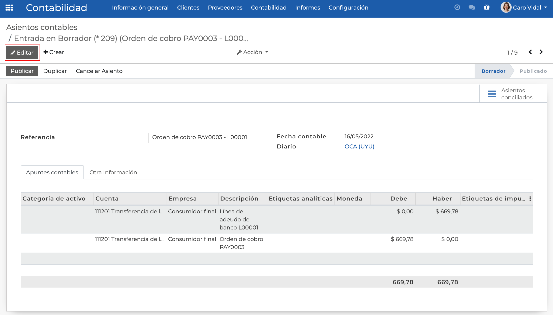 Una vez terminado este proceso, procederemos a publicar el asiento haciendo clic en el botón Publicar: